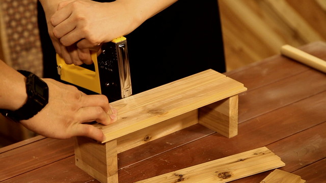 正面、背面共に、ウッドタイルをハンドタッカーで固定します。