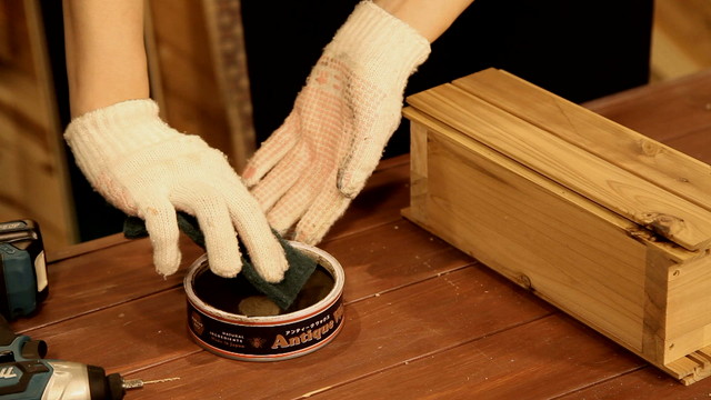今回は、木材の色付と艶出しを同時にできるワックスを使って表面を仕上げます。