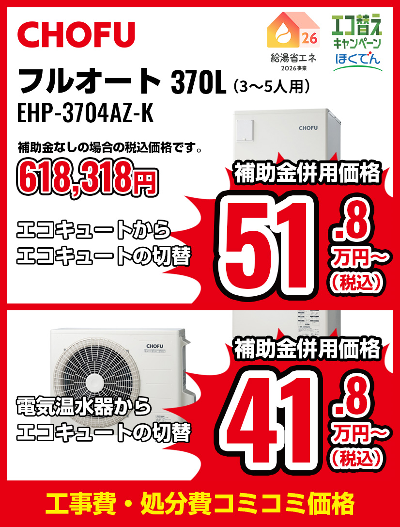 - 空気の熱を使ってお湯をつくる「ヒートポンプ式」で、とっても省エネ