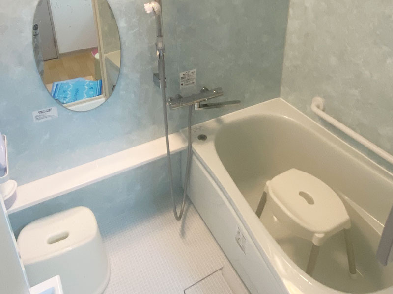 水色をメインにした配色や、ミラーの形など奥様のセンスが詰まったユニットバスになりました。