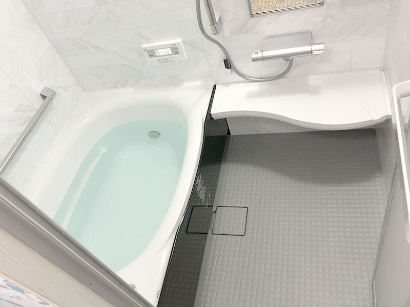 LIXILショールームで選ばれたパネルの組石ホワイトがとても綺麗で、高級感のある浴室へと生まれ変わりました!