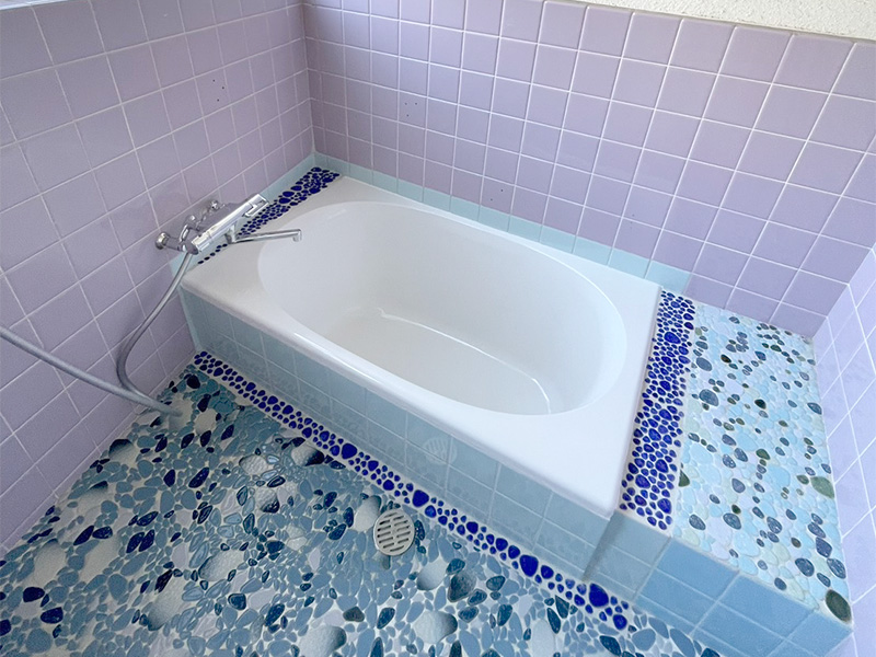 浴槽:LIXIL グラスティN浴槽 タイル①:KYタイル BRIGHT36 タイル②:オザワモザイクワークス オールドクラブ ペブルストーン |