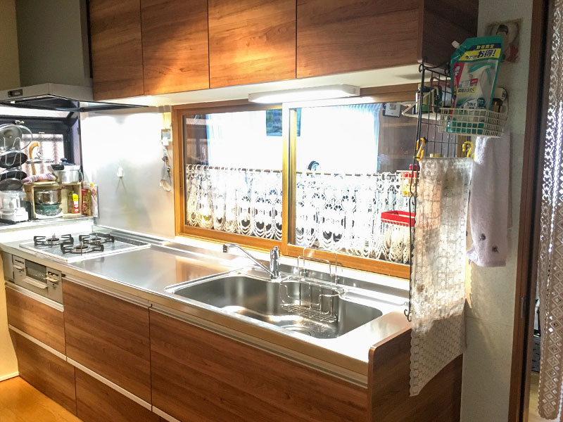 新しいキッチンは収納スペースを広げることで、使いやすくなったかと思います。デザインは重厚感があり高級感溢れるダークブラウンの木目調のキッチンを選ばれました。