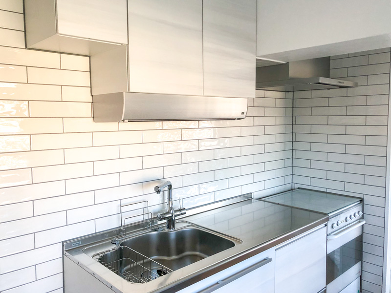 最近のキッチンリフォームは、清掃性の観点などから壁面はパネルで施工することが多いのですが、今回はインテリア性の高いタイルでの施工をご希望され、ご用意いただいたタイルをこちらで壁面へ施工させていただきました。タイル仕上げという事で高級感もあり、お部屋の雰囲気ともマッチしてカッコいい仕上がりになりました。