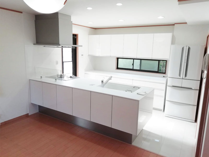 ・既存対面キッチンの間仕切り壁を全撤去し、ペニンシュラ型キッチンを設置しました。キッチンはフロートタイプにし、少しでもLDKが広く見えるようにしました。
