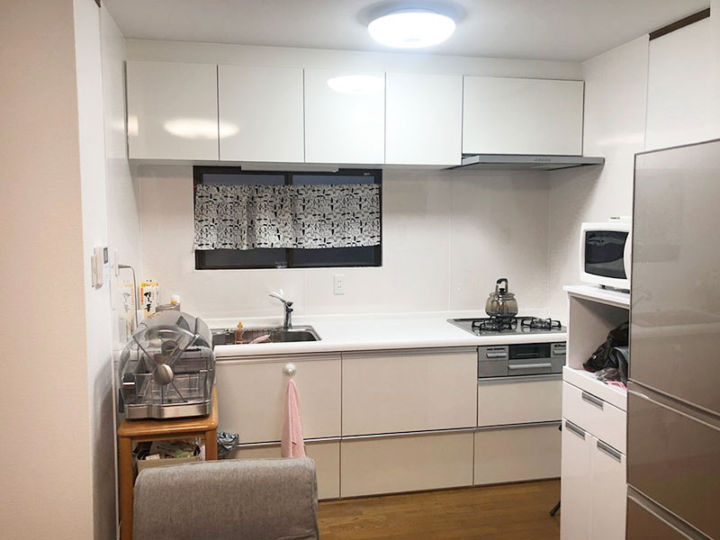 ・シンプルな白いキッチンに白系のクロスを併せたことにより、室内全体が明るくなりました。