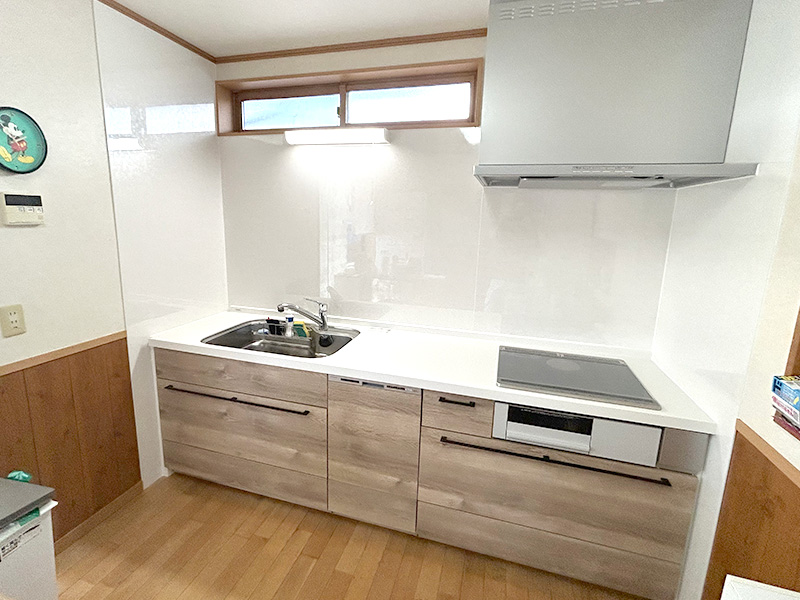 吊戸棚を撤去し、壁にはキッチンパネルを貼ることで、すっきりとしたキッチンに仕上げました。
