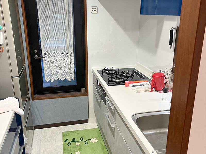 キッチン:LIXIL シエラS(扉色:クラシックブルー) コンロ:パロマ フェイシス グランド |