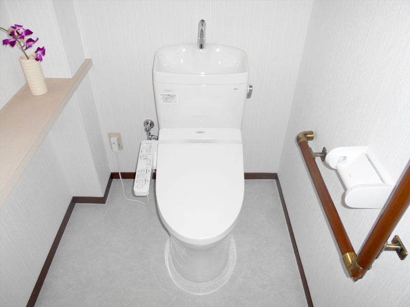 トイレ:TOTO ピュアレストQR(手洗い付き#NW1) 便座:TOTO ウォシュレット(SB#NW1) アクセサリー:TOTO 紙巻器(YH500#NW1) クッションフロア:シンコール ポンリューム(品番:E2144) クロス(天井、壁):シンコール SLプラス(品番:SLP891、SLP881) | ||