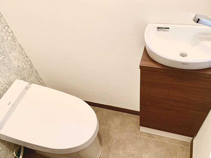限られた空間の中で、タンクレストイレと手洗い器を分けて設置したいということで、お客様にはショールームへ足を運んで頂き、実際のサイズ感などを確認して頂きました。