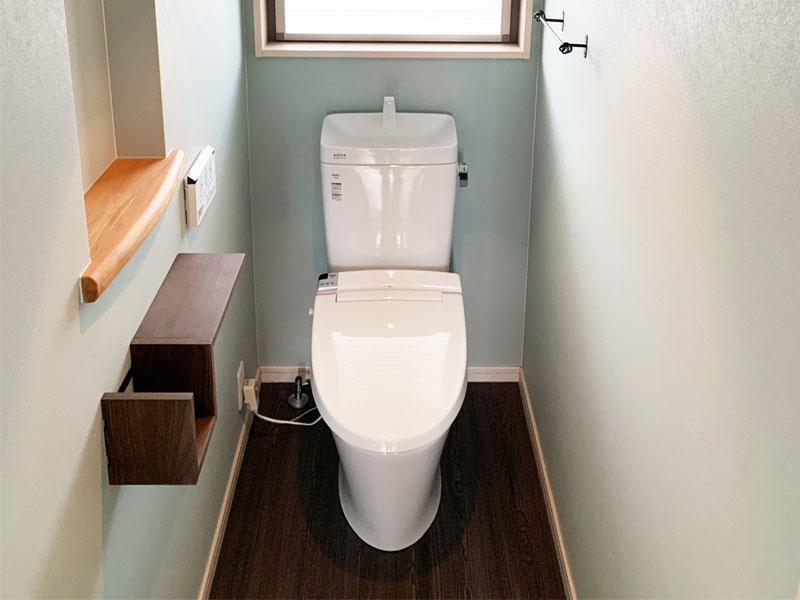 ライトブルーのクロスがさわやかなトイレ空間