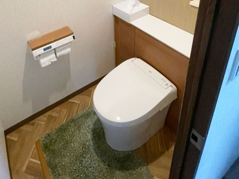 キャビネット付きトイレとクロス&クッションフロアとのバランスが、とてもオシャレに仕上がり大変嬉しく思います。便座自動開閉もついたグレードの商品をお選びいただきましたので、機能面も充実したトイレになりました。