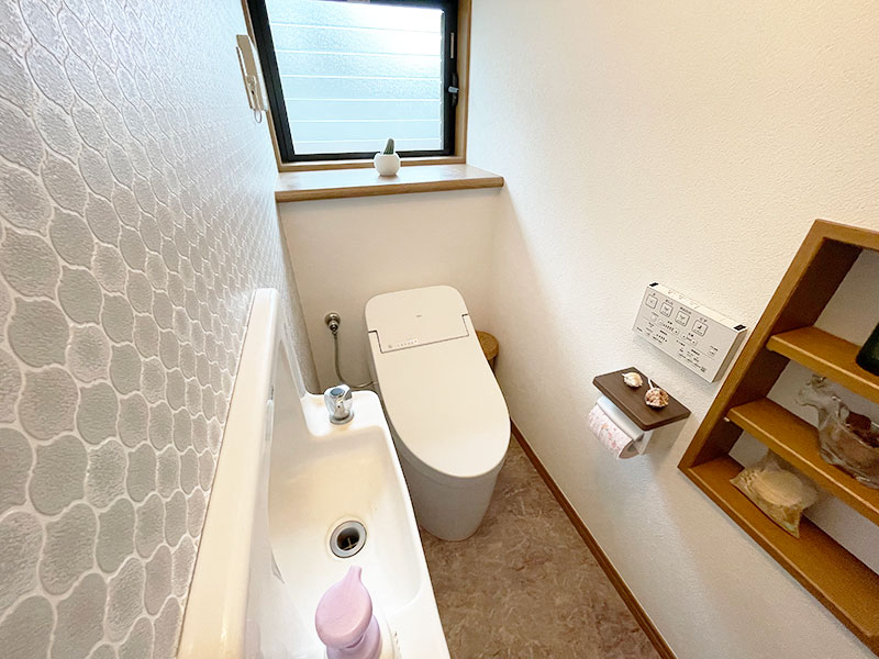 タイル風のクロスがかわいい、オート機能が便利なトイレ