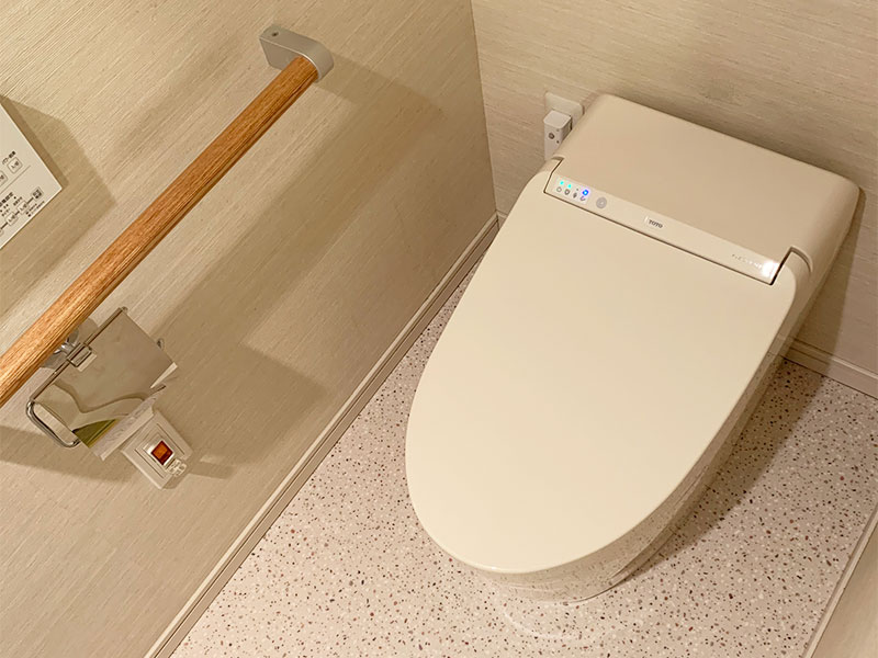 トイレ:TOTO ネオレストDH1(色:アイボリー) 床材(クッションフロア):サンゲツ Hフロアコンパクト(色柄:プントテラゾー、品番:HM-15113) |