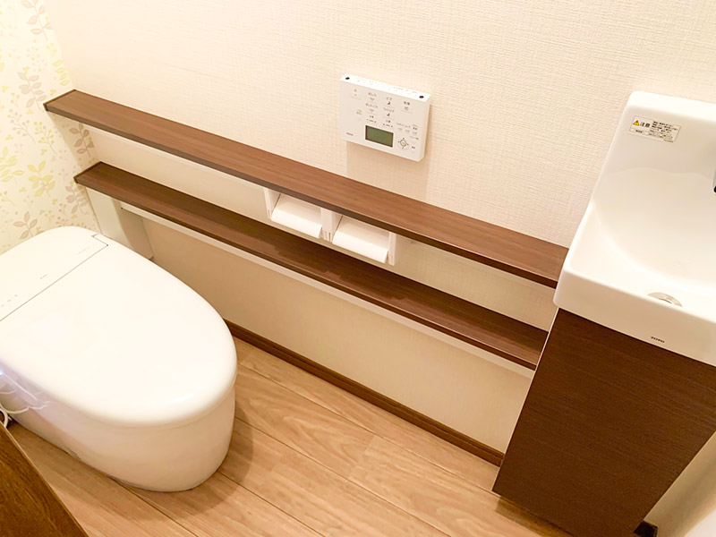 タンクレストイレは丸みを帯びたデザインで高級感があり、棚の木目のデザインに合わせて内装はナチュラルで暖かみのある仕上がりになりました。