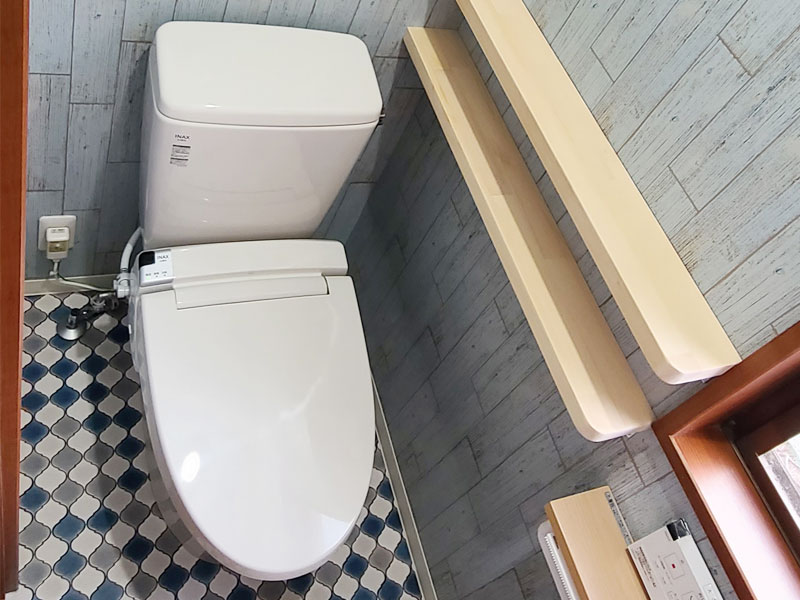 内装と造作の収納棚が映えておしゃれなトイレ空間になりました。