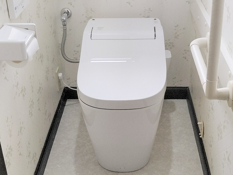 既設の手すりとクロスは残し、不要になったタオルリングは撤去しました。タンクありのトイレからタンクレストイレに変わったことによって空間が広くなりました。