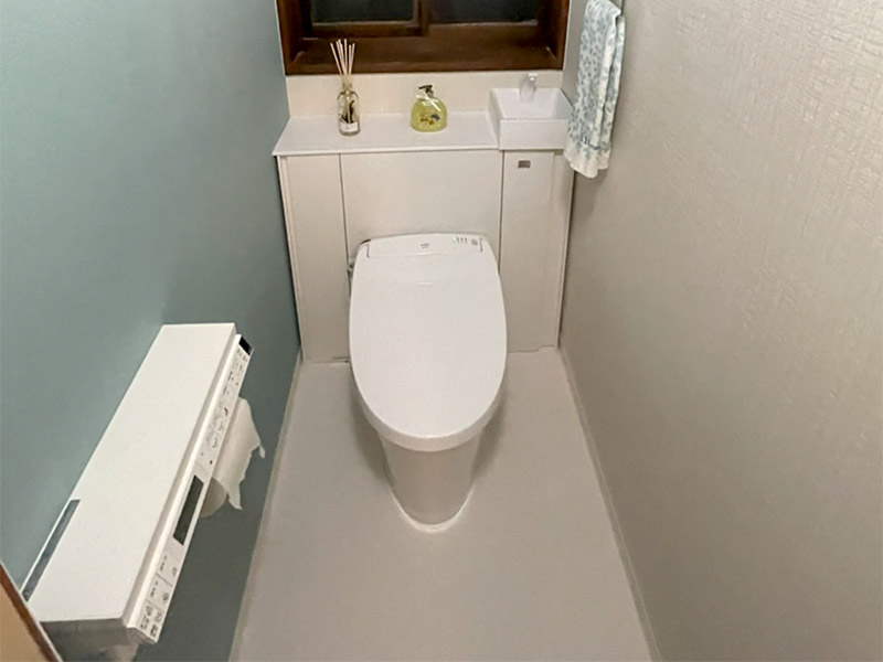 トイレ空間が綺麗になるように提案させていただきました。一面に貼ったアクセントクロスもオシャレに仕上がり、トイレ本体はキャビネット付きトイレのリフォレをご提案させていただきました。