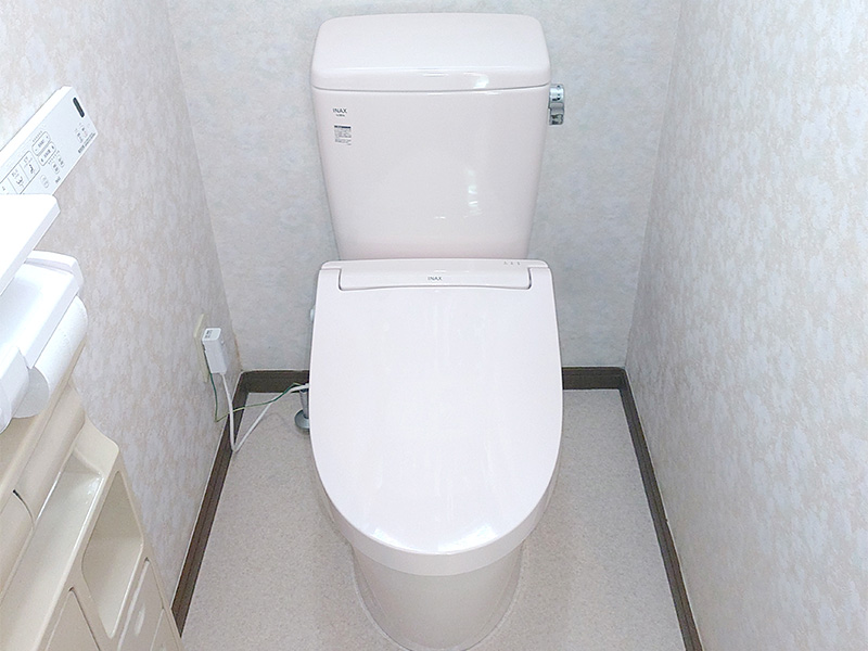 交換前のトイレの色はブルーでしたが、今回は雰囲気を変えたいというご要望で、クッションフロアとトイレをピンクに変更いたしました。