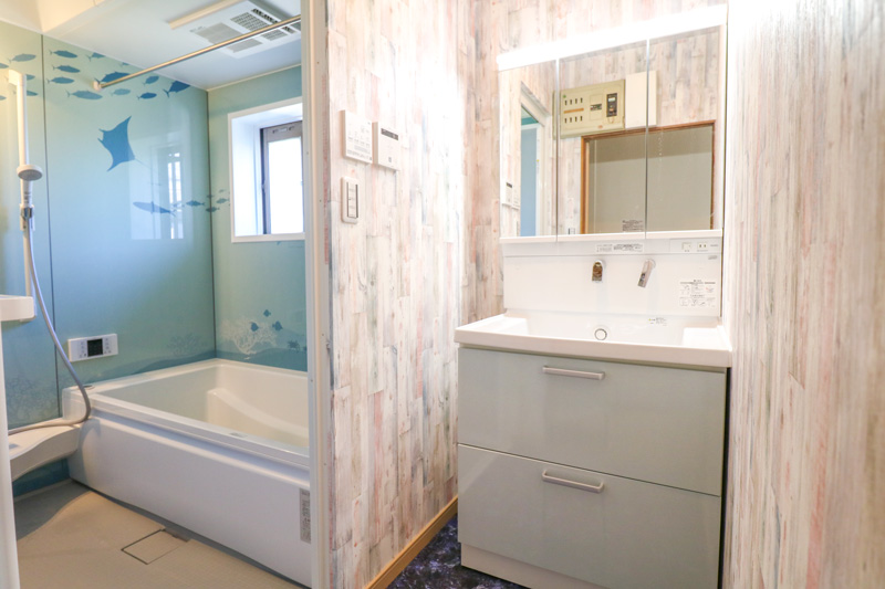 さらに浴室は水族館のようにも見えるパネル、洗面所には大理石調の床材をご提案させていただき、過ごしてたのしい空間に仕上がりました。