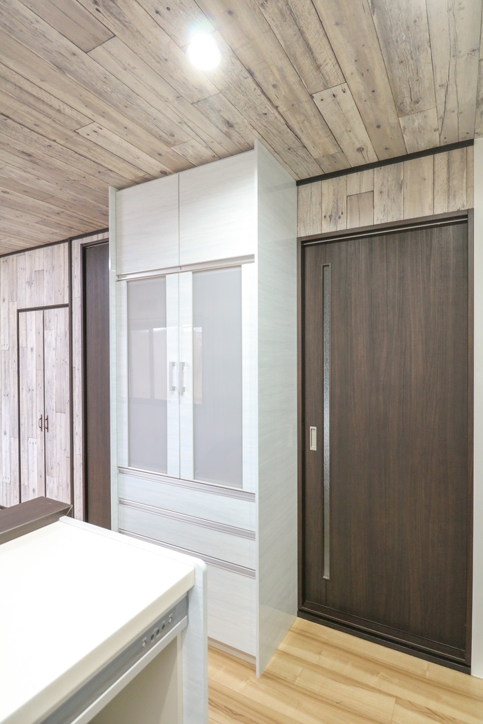 クロスや設備機器の色・柄など、見た目について決める際には、無難なものか変わった空間どちらにしたいかをお尋ねすると、やはり即決で「やるからにはせっかくだから面白い空間にしたい!」と意欲的なお客様。このご意見により、クロスはすべて木目のものに。