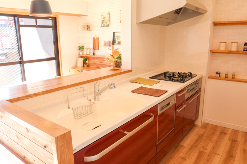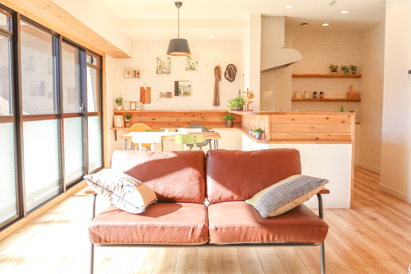 3LDKのスペースを確保し、キッチンの吊り戸棚の部分の壁もなくすとリビングダイニングとの繋がりが感じれるようになって配膳も楽になりました。リビングも広がったことで、子供が走り回って大変です(笑)
