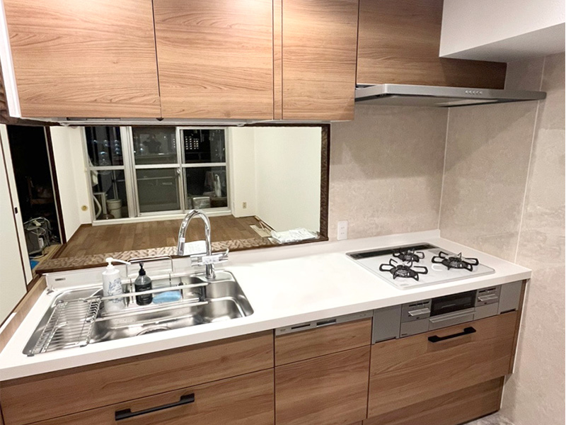キッチン周辺をカップボードや冷蔵庫などを設置するのに伴い、キッチンをL型→I型に変えたい。
