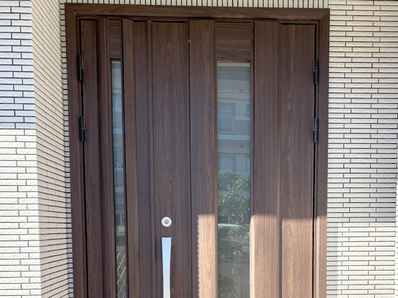 玄関ドア表面が、日光の影響で変色している。
