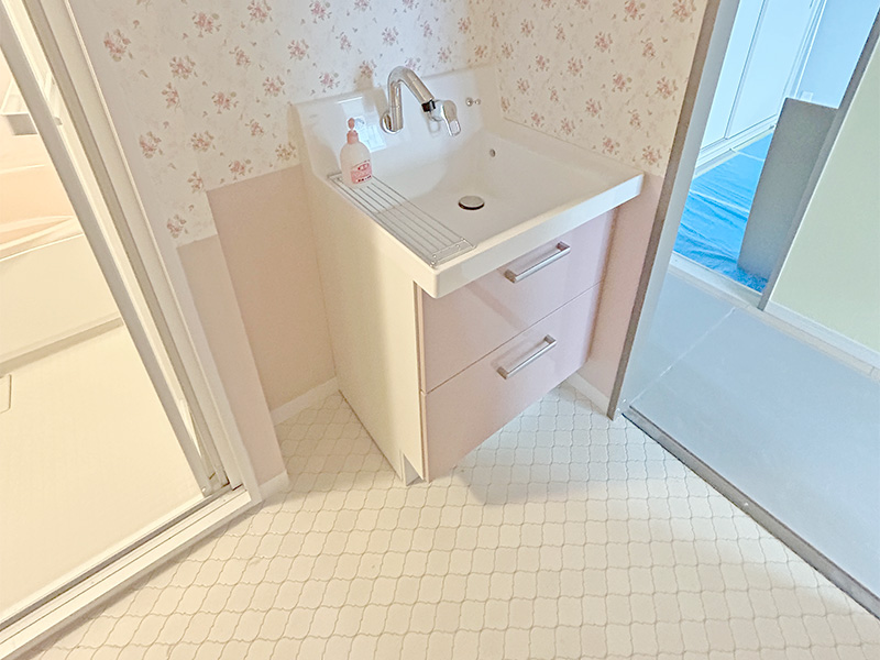 可愛らしいピンククロスと統一感のある洗面化粧台